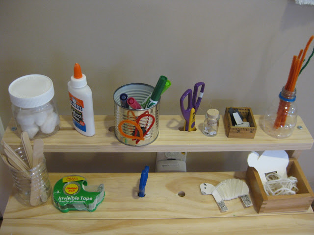 Because I plan to stock it full of recycled materials for creating, I wanted to use some of these materials for organizing as an example of thinking "outside the box". This shelf contains cotton balls, glue, markers, decorative edge scissors, google eyes, magnetic tape, pipe cleaners, popsicle sticks, tape, regular scissors, and left over craft projects to complete.