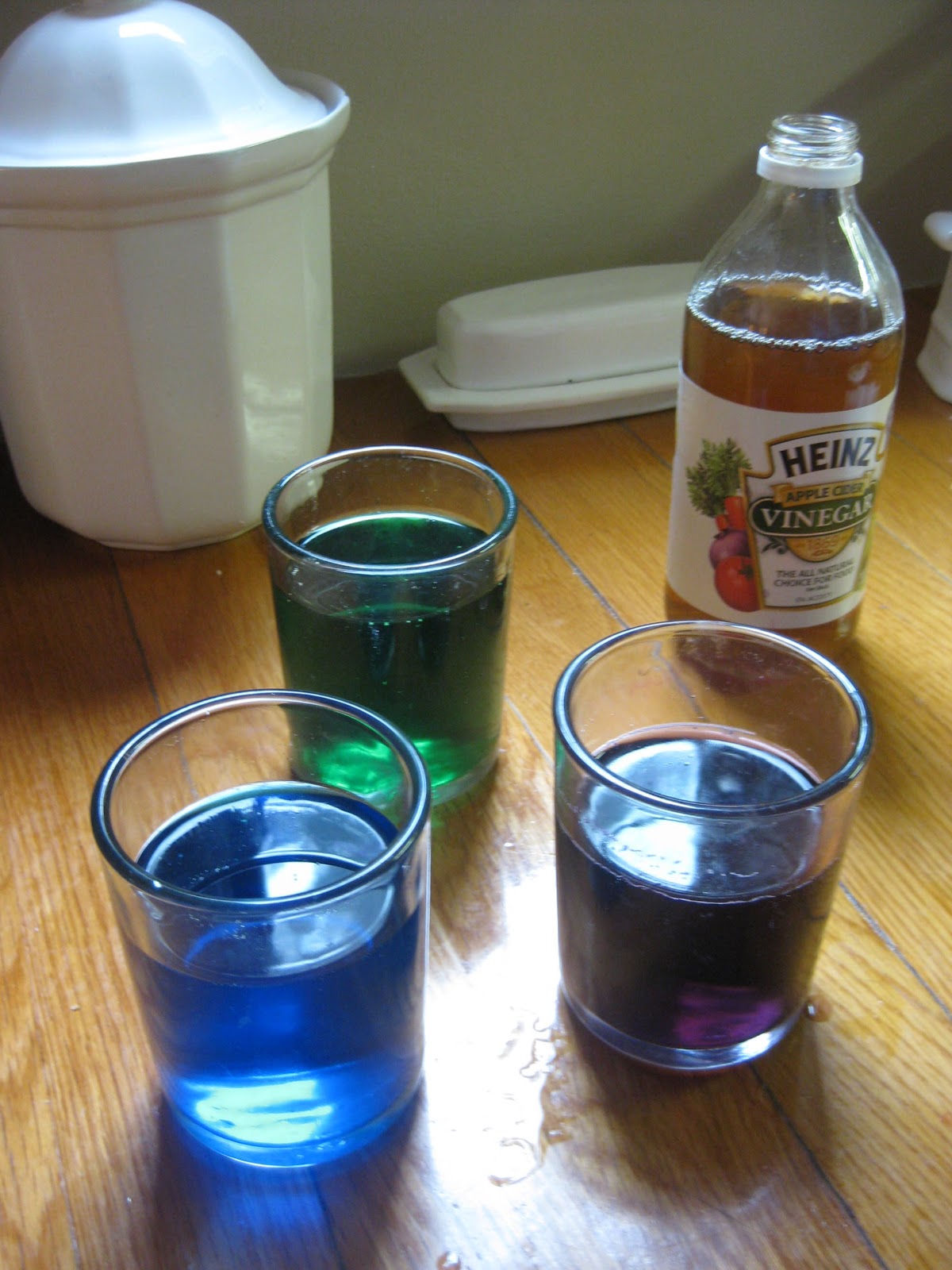 I hard boiled the eggs ahead of time (and prepared some for the preschool group as well). After they were shelled we cut them in half and removed the yolk. Next, my daughters chose what colors they wanted (two each) and we prepared the glasses of water.